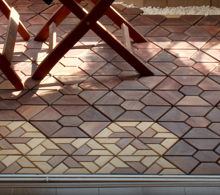 A more interesting challenge it to make sure the pattern can be tessellated. Nobody can afford to have people on site fitting together small pieces of wood. Can the pieces be made into a practical sized tile that fits together and can be tiled infinitely? I usually do this on CAD. Normally it is not difficult, but sometimes it is a challenge to find a nice repeating pattern within the floor than can be made and which will fit together easily at installation. In this case I was too busy and had Xiao May in my office put this together and then cut up some duplicates to make sure it would work.